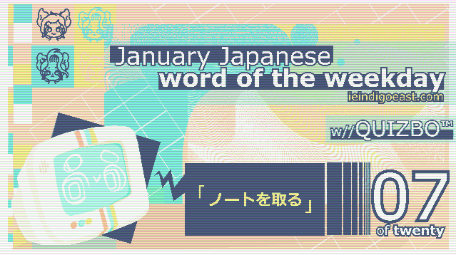 Today’s vocabulary is from January Japanese Word of the Weekday w//QUIZBO™ Lesson 07 of 20. This lesson’s word or phrase is【ノートを取る】