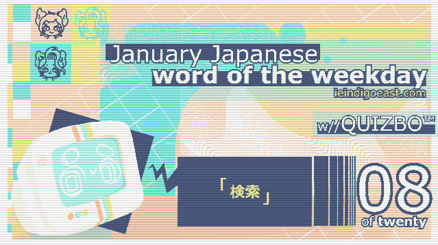Today’s vocabulary is from January Japanese Word of the Weekday w//QUIZBO™ Lesson 08 of 20. This lesson’s word or phrase is【検索】