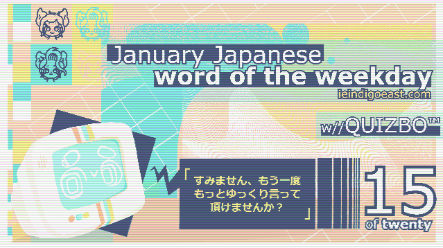 Today’s vocabulary is from January Japanese Word of the Weekday w//QUIZBO™ Lesson 15 of 20. This lesson’s word or phrase is【すみません、もう一度もっとゆっくり言って頂けませんか】